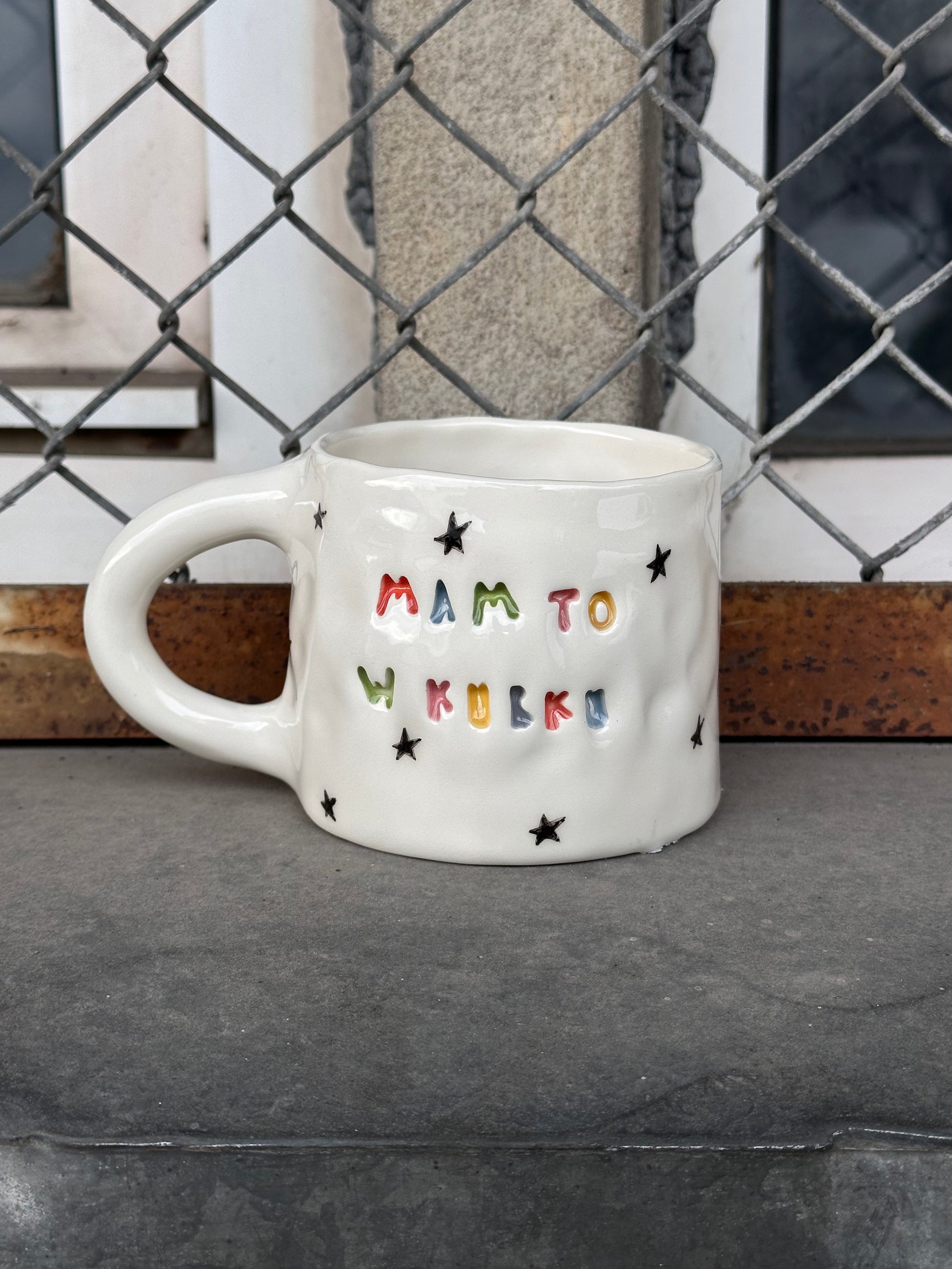 Ręcznie lepiony i malowany, więc każdy trochę inny, trochę krzywy, z możliwą dołeczką tu czy tam — ale właśnie w tym cały jego urok.