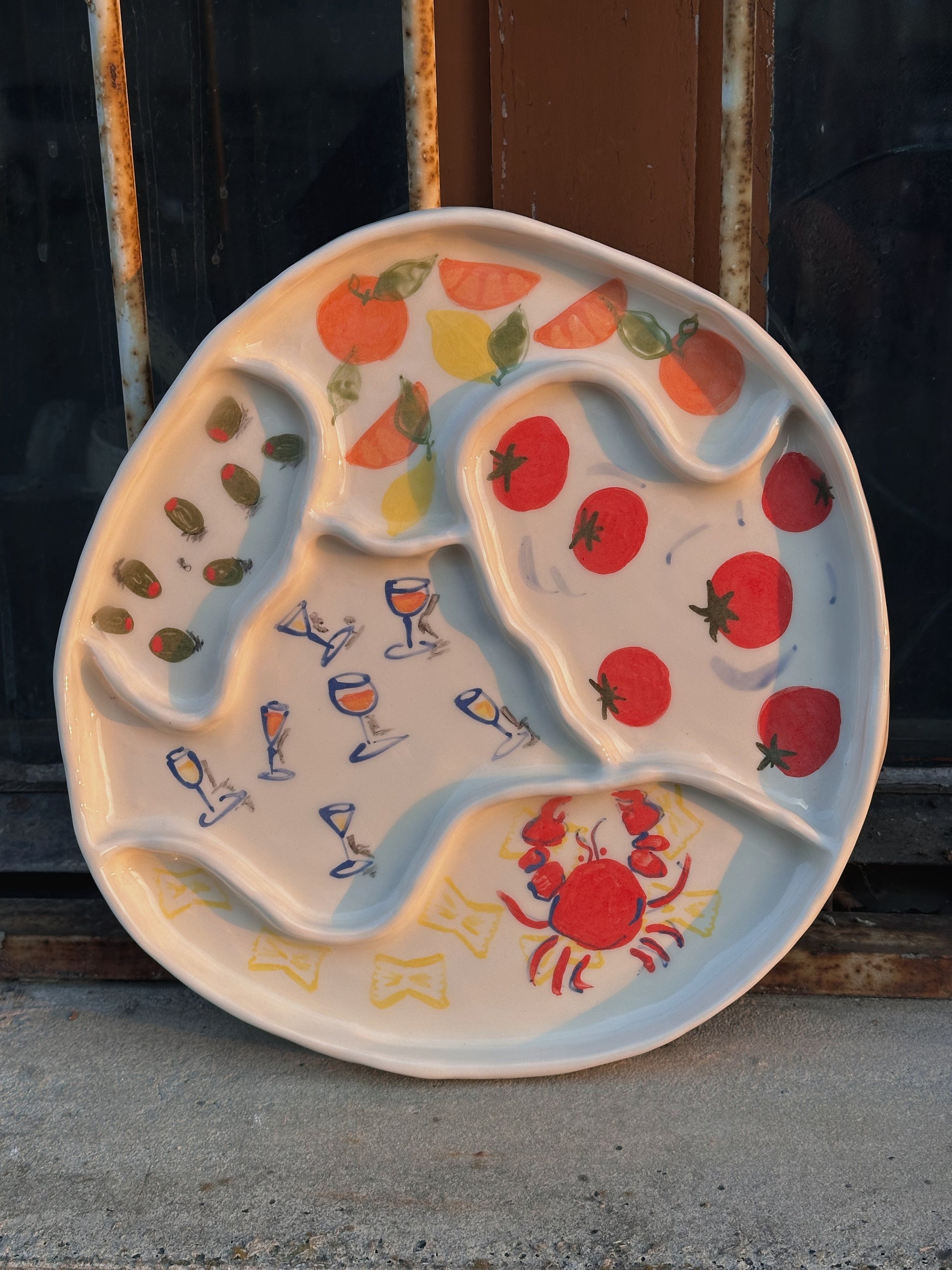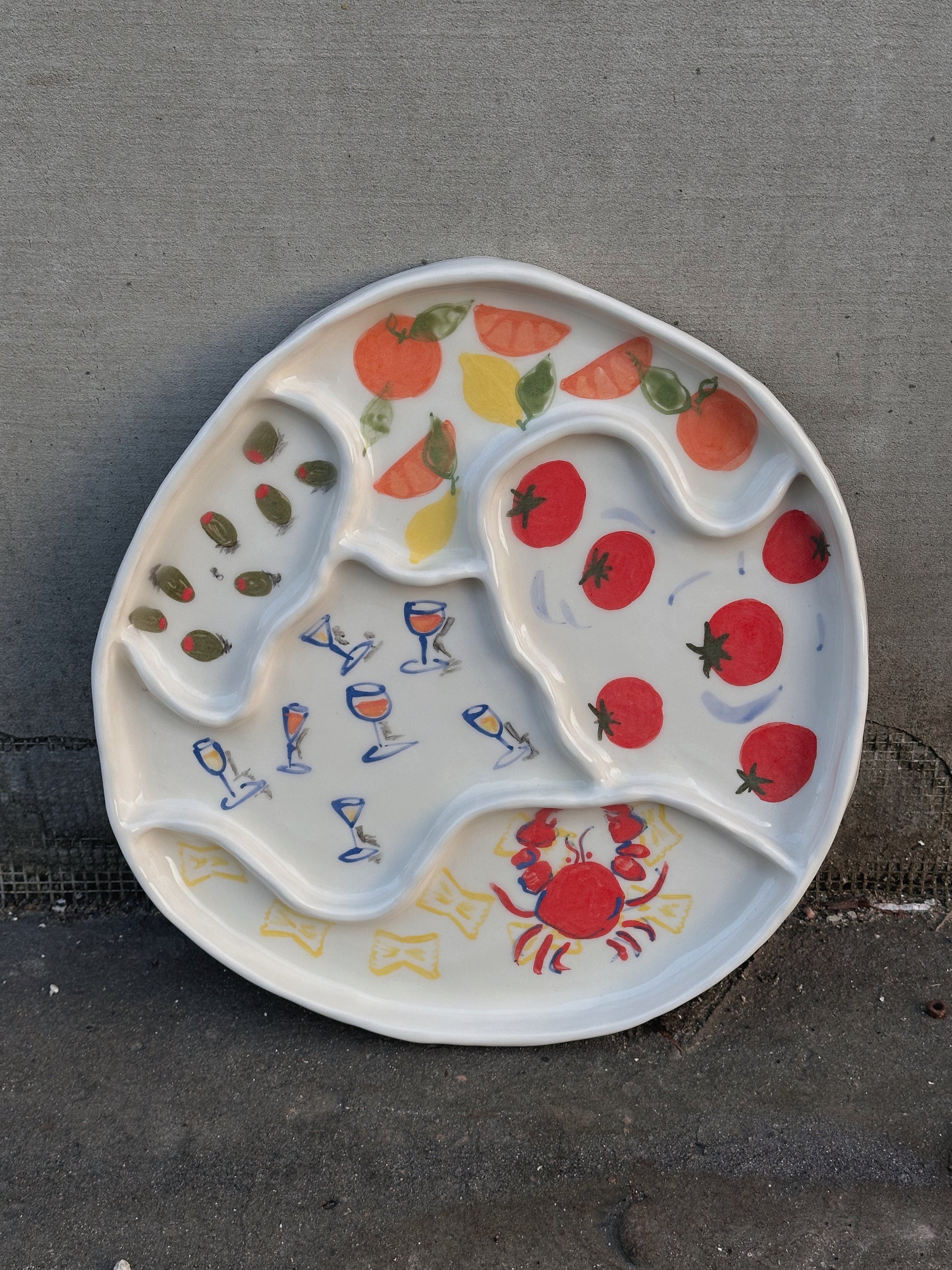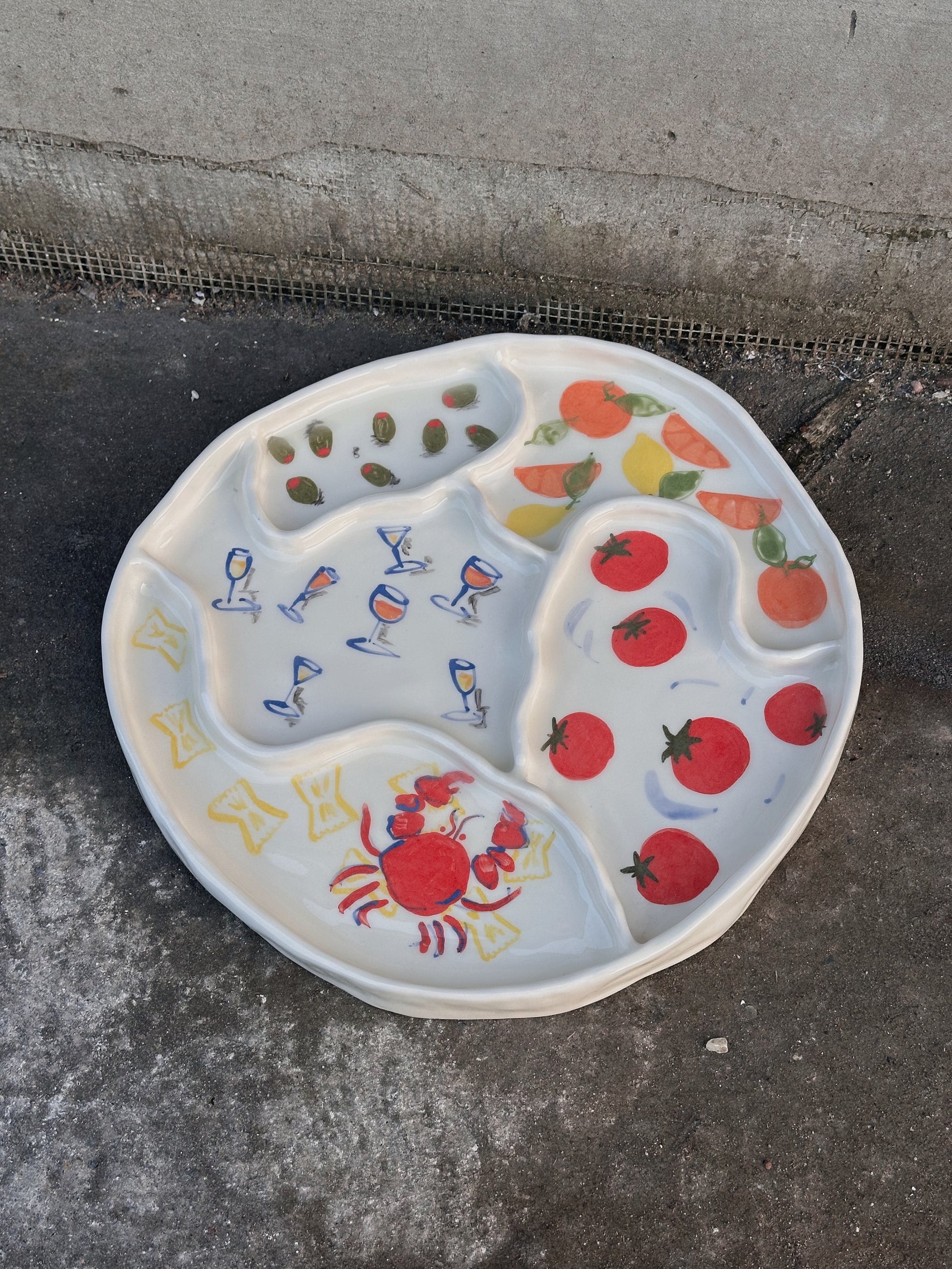 Duża patera wykonana z białej gliny, idealna do serwowania przekąsek, owoców lub dodatków na stół.