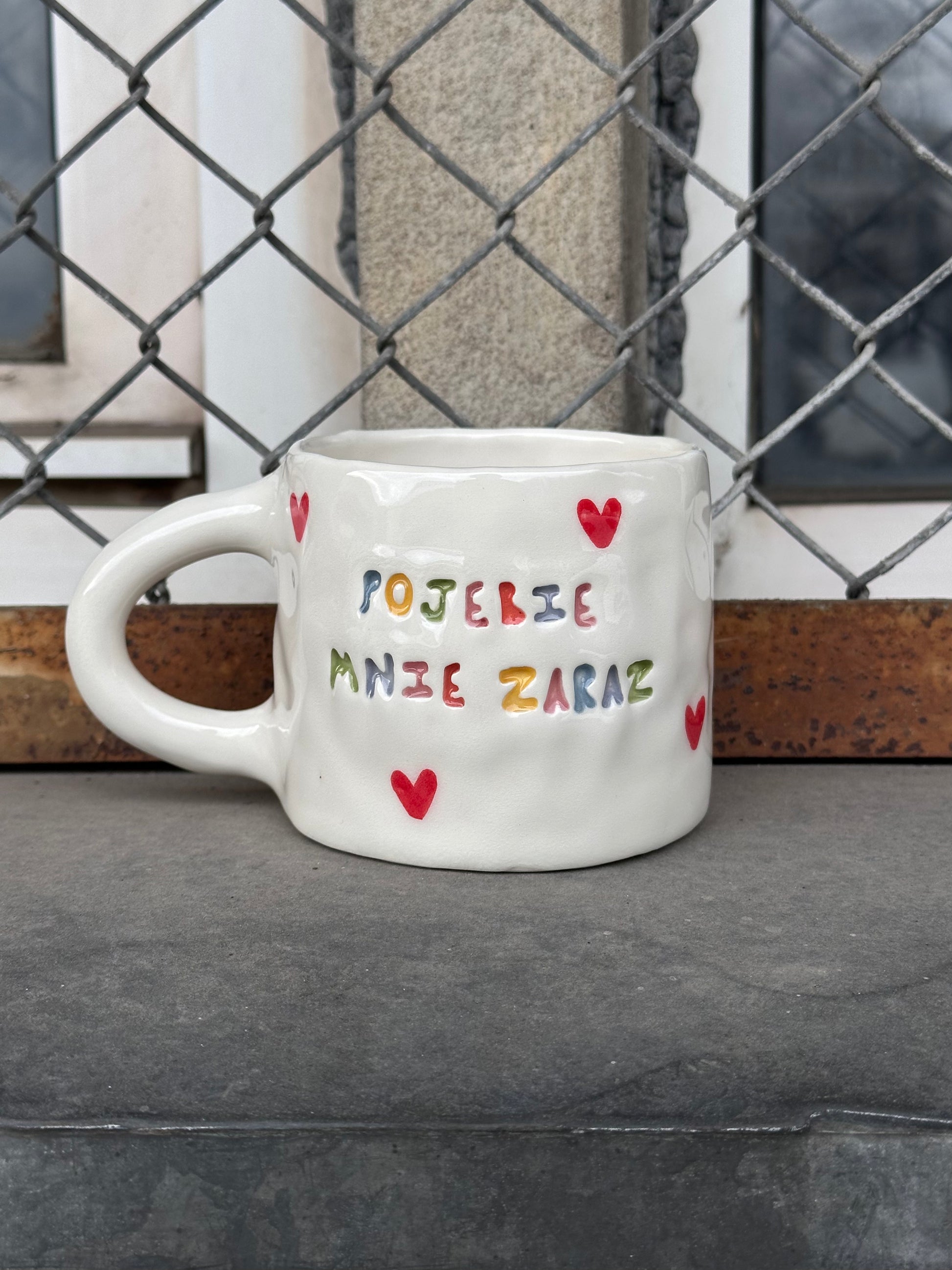 Ręcznie lepiony i malowany, więc każdy trochę inny, trochę krzywy, z możliwą dołeczką tu czy tam — ale właśnie w tym cały jego urok.
