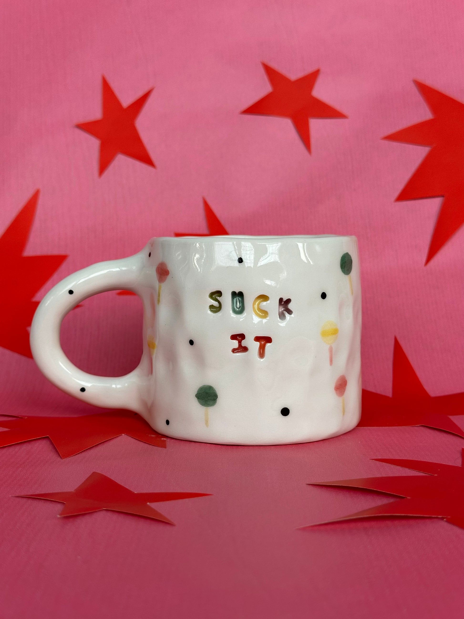 Ręcznie lepiony i malowany, więc każdy trochę inny, trochę krzywy, z możliwą dołeczką tu czy tam — ale właśnie w tym cały jego urok.